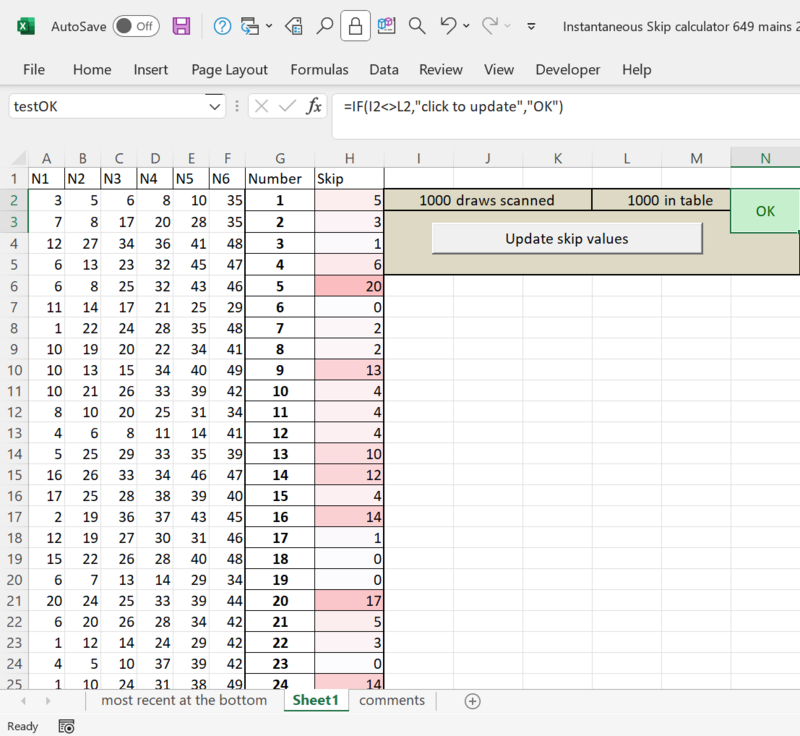 This is my attempt at getting instantaneous skip readout for 649 without bonus. Assumes the data starts with draw 1 at the top down to the most recent draw at the bottom and all draws are numbered.
