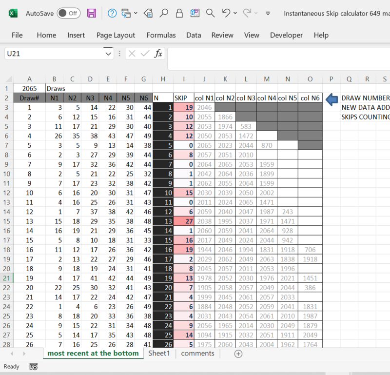 It is not necessary to instantly calculate a skip because that depends on which of the six columns holds the most recent ocurrence and its draw number. Initally that part of the calculation is left out of the formula, we just need to find the most recent draw number for each number per column.